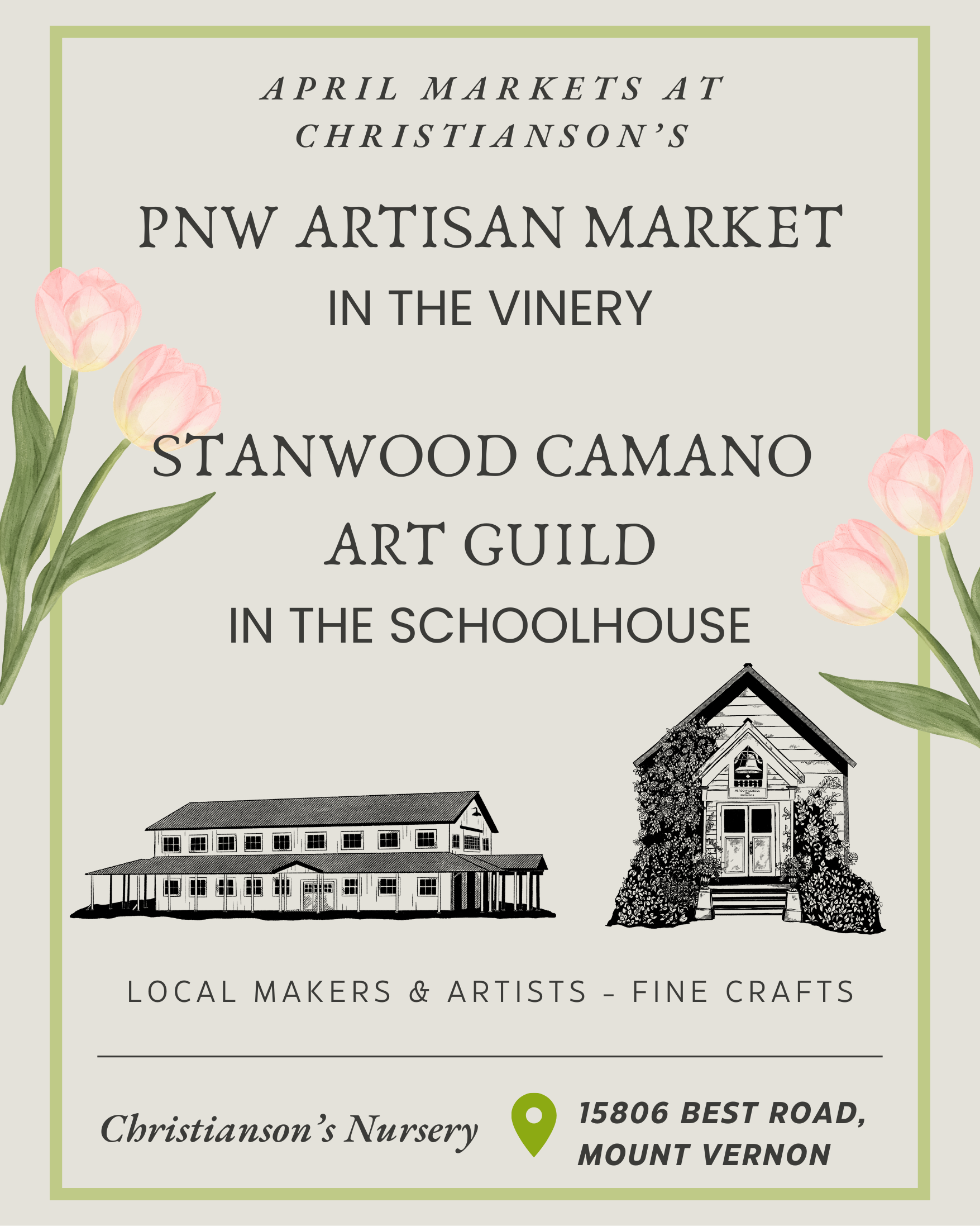 During the month of April, Christianson’s Nursery celebrates Tulip Festival season with two vibrant showcases of local creativity. The Vinery hosts the PNW Artisan Marketplace featuring more than 140 Pacific Northwest makers offering ceramics, jewelry, textiles, garden art, and handcrafted goods, while the historic 1888 Schoolhouse becomes a gallery for Art in the Schoolhouse, highlighting paintings, photography, sculpture, stained glass, and mixed media by members of the Stanwood-Camano Arts Guild.